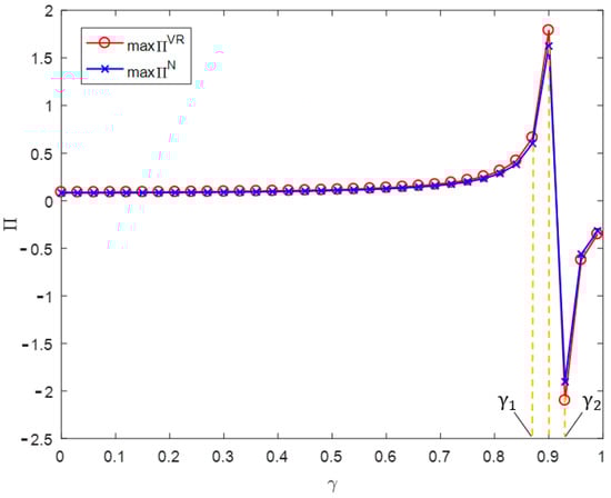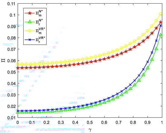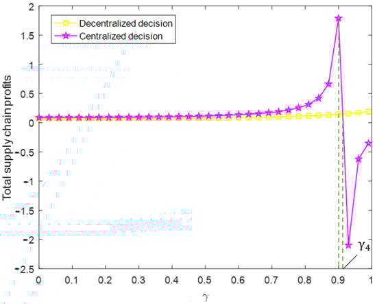 Figure 4 shows that, when consumers’ green preferences are , the total profit of the construction waste resource utilization supply chain under centralized decision making is higher than that under decentralized decision making. When consumers’ green preferences are , the total profit of the CDW resource utilization supply chain under centralized decision making reaches the maximum value, and then decreases sharply. When consumers’ green preferences are , the total profit of the CDW resource utilization supply chain is equal under centralized and decentralized decision making. Then, when consumers’ green preferences are , the total profit of the CDW resource utilization supply chain under centralized decision making is lower than that under decentralized decision making. In general, with the increase in consumers’ green preferences, the total profit of the CDW resource utilization supply chain under centralized decision making is first greater than, and then smaller than, that under decentralized decision making. Therefore, in the case of the absence of government subsidies, the centralized or decentralized decision-making model should be selected according to the degree of consumers’ green preferences in order to maximize the total profit of the CDW resource utilization supply chain.