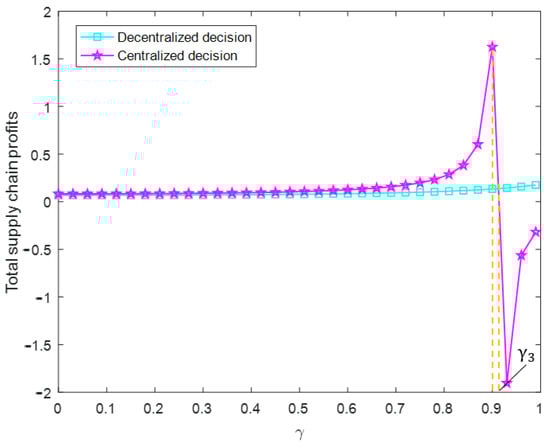 The impact of γ on total CDW supply chain profit without government subsidies.