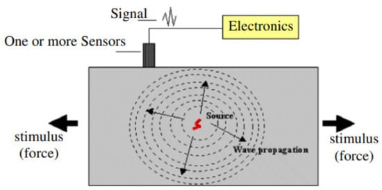 AE is a type of transient elastic wave generated by the rapid release of energy from local sources. The acoustic monitoring system is composed of material deformation as the excitation source and sensors as the receiving source to receive the generated stress wave. The schematic shown in Figure 1 is the general working principle of an acoustic monitoring system [44]. A generalized theory of AE based on elasticity was proposed in the last century [45]. It has been reported that the applicability of this theory is closely related to the characteristic length of the material [46]. In the frequency range of less than 50 kHz, the wavelength of elastic waves in concrete is typically larger than the size of the aggregate. Therefore, concrete could reasonably be understood as employing uniform elastodynamics, which is used to handle stress waves caused by external forces or impacts and AE waves caused by cracking [47]. The governing equations of elastodynamics are referred to as Navier–Stokes equations [46].