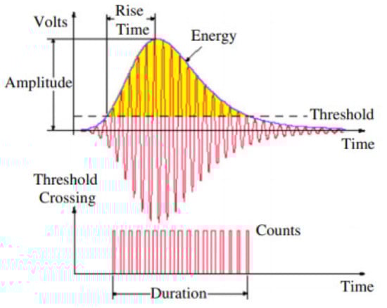 In general, AE could be divided into two emissions. The first emission is generated from the interior of the material, while the second emission is from an external source. Acoustic radiation detection is closely related to the characteristics of stress wave attenuation, wave pattern, multipath effect, and source location algorithm criterion, among others [60]. Generally, AE monitoring schemes include global and local methods. Local monitoring is primarily aimed at damage in specific areas, and global monitoring is conducive to evaluating the integrity of the entire structure [61]. Most traditional AE sensors employ piezoelectric elements to convert the measured transient elastic mechanical waves into AE electrical signals [44]. Further, in the process of bridge monitoring, unidirectional sensors and sensors that are sensitive to internal wave modes are helpful in distinguishing the AE sources in various components of the bridge. Generally, the collected signal can be represented by characteristic parameters, such as duration and amplitude, as shown in Figure 2.