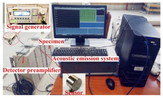 Ma employed an AE system (as shown in Figure 3) to detect the compactness of the sleeve grouting connection and analyze the AE signal characteristics under different concrete strengths, compactness, and hollow sleeve positions [62]. The results showed that the amplitude of C30 concrete is higher than that of C40 concrete, while the amplitude of the dense grouting sleeve is higher than that of the hollow sleeve. Li et al. [63] used AE technology to detect cracks in concrete hollow slab bridges. By studying the relationship between crack propagation and AE signals, it is concluded that low-amplitude signals are generated due to the propagation of microcracks and the mutual friction of old crack fracture surfaces. The high amplitude signals are generated by the further propagation of macro cracks. Carpinteri et al. [64] described the fracture experiments of rocks and cementitious materials of different sizes and examined the extended application of similar schemes in the actual size structure in the multi-scale method. In addition, other scholars applied AE detection technology to study the corrosion and cracking of reinforced concrete and verified the reliability of this method [65,66,67].