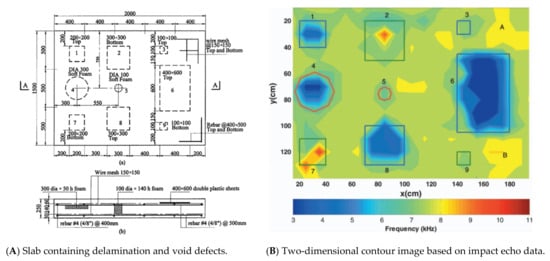 (A) Slab containing delamination and void defects. (a) Plan view; (b) Cross Section A-A; (B) Two-dimensional contour images of Slab built up using air-coupled impact-echo data. The solid lines indicate the location of defects [75].