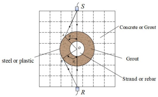 Lu et al. [98] used ultrasonic tomography technology to evaluate relevant parameters affecting grouting quality and analyzed the effects of these parameters by employing a theoretical model (as shown in Figure 7). It is assumed that the propagation path of ultrasonic wave around the pipeline is SABR, ∠AOS = , ∠BOR = , and the diffraction radius is r.