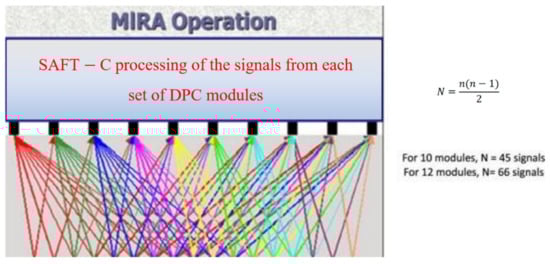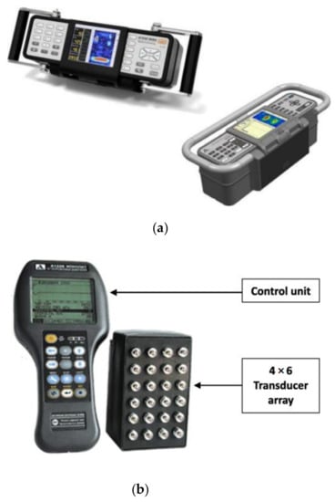 De La Haza et al. [99] introduced the basic characteristics of two ultrasonic testing equipment (Figure 8) developed at the beginning of this century. The dry point contact (DPC) shear wave transducer array was applied to generate 2D and 3D tomographic images of reflected waves. Shear wave, DPC sensor, image reconstruction method, synthetic aperture focusing technology (SAET), and schematic representation of digital focusing array signal capture scheme were also introduced (Figure 9). Shokouhi, P. et al. [100] evaluated the accuracy and precision of low-frequency ultrasonic detection of concrete bridge deck delamination using a multi-probe ultrasonic detection system. The results indicated that delamination defects as small as 30 mm could be reliably detected by using a multi-probe ultrasonic array. Shah, A.A. et al. [101] studied the ultrasonic nondestructive evaluation of defects or damages at micro and macro scales in concrete under initial and peak horizontal loads. It was found that the damage attenuation amplitude of the high-pressure pulse is greater than that of the low-pressure pulse. The pulse velocity was sensitive when the damage degree exceeded 60% of the ultimate strength of concrete.