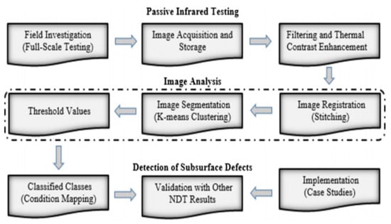IRT has been used in experimental research on concrete delamination detection. Scholars have developed and analyzed the heat transfer model of concrete blocks with artificial stratification to explore the effective use of sensitive parameters of IRT. Consequently, it was confirmed that the stratification area has a greater impact on the detection ability of IRT than the thickness and volume [119]. Omar et al. [120] proposed an automatic program for detecting and classifying the delamination of concrete bridge decks. The flow of the method is shown in Figure 11. A specially written code was used to create the splicing thermal map of the entire bridge deck from a single image. Field detection showed that the program could effectively identify the layered area of the bridge deck.