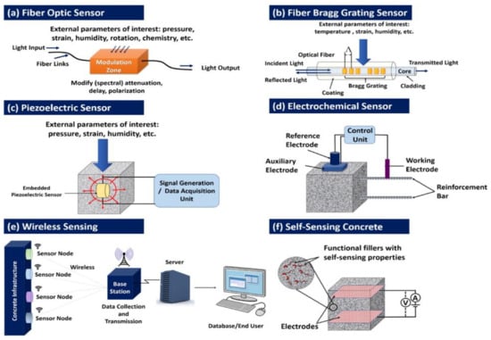 - Taheri, S. A review on five key sensors for monitoring of concrete structures. Constr. Build. Mater. 2019, 204, 492–509. [Google Scholar] [CrossRef]