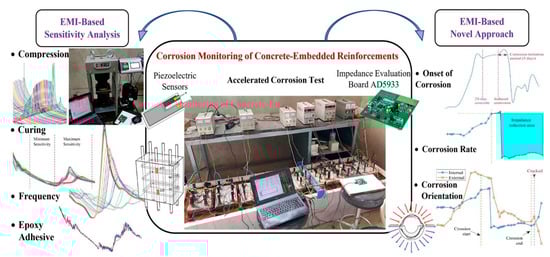 - Ahmadi, J.; Feirahi, M.H.; Farahmand-Tabar, S. A novel approach for non-destructive EMI-based corrosion monitoring of concrete-embedded reinforcements using multi-orientation piezoelectric sensors. Constr. Build. Mater. 2021, 273, 121689. [Google Scholar] [CrossRef]
