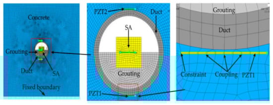 - Jiang, T.; Zheng, J.; Huo, L. Finite Element Analysis of Grouting Compactness Monitoring in a Post-Tensioning Tendon Duct Using Piezoceramic Transducers. Sensors 2017, 17, 2239. [Google Scholar] [CrossRef] [Green Version]