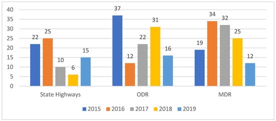 Overruns have been a regular and redundant phenomenon impacting the performance and overall project delivery of highway projects []. Currently, the major challenge in Indian road construction projects is an encroachment on the right of way, acquisition of land, and disputes between contracting parties, though the scope of such conflicts was limited to the maintenance and relaying of village road projects. The procurement selection for strategic construction, e.g., major highways and expressways, are handled through the use of the built, operate, and transfer method [,]. However, from the information received through the Right to Information Act, 2005 (RTI), over 35% of road/highway construction projects were delayed due to claims and counter claims, and approximately 10% were subjected to arbitration. Figure 1 provides a summary of disputes reported in various State Highway, Other District Roads (ODR) and Major District Roads (MDR) for the financial year 2015–2019; this information was obtained through RTI.