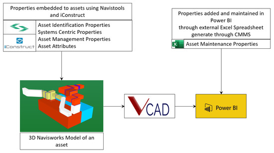 Using Navistools [32] and iConstruct [33], plugins for Navisworks, the Asset Identification Properties, Systems-Centric Properties, Asset Attributes, and Asset Management Properties are embedded in the Navisworks model to create an FM-capable BIM. Properties from the fifth category are imported directly into Power BI through an external excel spreadsheet. This demonstrates how additional data entered into or generated by a facility management system (e.g., a Computerized Maintenance Management System-CMMS) can be integrated at a later point with data already embedded in the model at project handover.