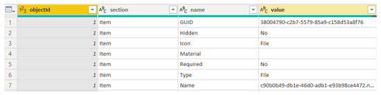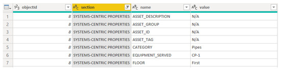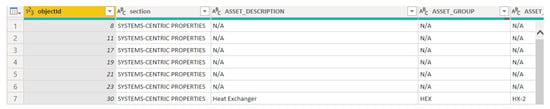 First, the ‘section’ column for each of the three tables is filtered to show only data rows with a ‘SYSTEMS-CENTRIC PROPERTIES’ value, an ‘ASSET MANAGEMENT PROPERTIES’ value, or ‘ASSET ATTRIBUTES’. Figure 5 shows an example of the Systems-Centric Table filtered by the ‘section’ column.