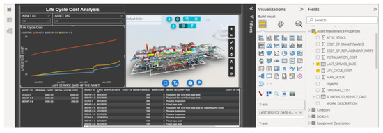 Different studies have benefited from insights driven from Power BI dashboards and graphs. The authors of [18] used Power BI graphs and dashboards to get insights about the space usage for designing facility layout. Further, refs. [15,16] used Power BI graphs and dashboards as an interactive tool for visualizing their facility data. Combining the features of Power BI with access to BIM can further enhance the decision-making processes. Power BI dashboards can be designed to address different types of maintenance requirements. For instance, dashboards can provide information necessary for responding to preventive maintenance such as information regarding valve access status, steam pressure, or supply airflow. Other dashboards can provide access to general asset information such as the model and the serial number of a piece of equipment. Dashboards provide a powerful tool to highlight specific Key Performance Indicators (KPIs) that matter most to the facility user.