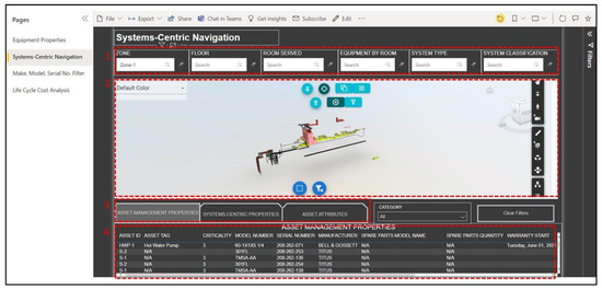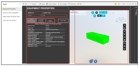 Figure 9 details dashboard 1 showing an example using the “ASSET ID” to filter data for the DOAS-1. Area 1 in Figure 9 houses drop-down filters based on the ASSET_ID and ASSET_TAG parameters. Area 2 is a model viewer window that displays the BIM. Asset property categories (Asset Management Properties, Systems-Centric Properties, and Asset Attributes) can be selected in area 3. Area 4 displays asset properties based on the category selected.