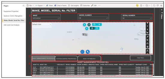 Figure 11 details dashboard 3 showing an example filtering assets for which MAKE = MITSUBISHI. This isolates all elements in the model that were manufactured by Mitsubishi and lists all their properties for the three categories. Area 1 of Figure 11 houses filters based on MAKE, MODEL NUMBER, and SERIAL NUMBER. Region 2 displays the BIM. Asset properties categories can be selected in region 3. Region 4 includes the tables containing Systems-Centric Properties, Asset Management Properties, and Asset Attributes for the assets.