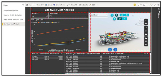 Figure 12 details the layout of Dashboard 4 used to display Asset Maintenance Properties for DOAS-1, WSHP-1-5, and WSHP-1-9. Area 1 of Figure 12 provides dropdown filters to isolate information in the dashboard based on Asset ID or Asset Tag. Area 2 displays the BIM. Area 3 houses the graph tracking the life-cycle cost of the asset based on original cost, installation cost, maintenance cost, and cost of the replacement part. Area 4 displays tables containing Asset Maintenance properties for the assets.