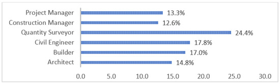 Figure 1 shows the respondents’ professions. It was demonstrated that quantity surveyor was the most common profession (24.4%). Second place was civil engineer with 17.8%; third was builder (17.0%); fourth was architect (14.8%), fifth most common were project managers (13.3%) and in sixth place were construction managers (12.6%).