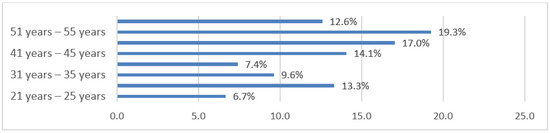 Figure 2 shows the age group of respondents. It shows that 19.3% of the respondent population were aged 51–55 years, 17.0% were aged 46–50, 14.1%were aged 41–45, 13.3% were aged 26 to 30, 12.6% were 56 or over, 9.6% were aged 31 to 35, 7.4% of the partakers were aged between 36 and 40 and 6.7% were aged 21 to 25.