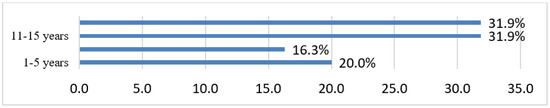 In Figure 3, the respondents’ years of experience in the construction industry is displayed. It was discovered that 31.9% of the partakers had 11–15 yrs. 31.9% had 20 years or more, 20.0% had 1–5 years and 16.3% had 6–10 years.