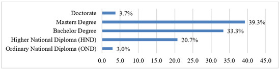 Figure 4 shows the respondents qualifications. It shows that 39.3% had a master’s degree, 33.3% had a bachelor’s degree, 20.7% had an HND, 3.7% had a doctorate and 3.0% had an OND.