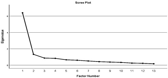 From Table 2, the KMO measure of sampling appropriateness achieved a number of 0.876. This is beyond the highest number of 0.6. This is suitable to continuing to EFA as any number more than 0.6 is specified suitable [55]. The Barlett’s test was also statistically substantial (<0.05).