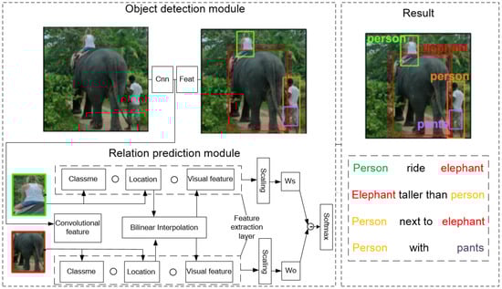 The VTransE method refers to the visual relationship as the subject–predicate–object triplet, where the predicate can be a verb, spatial (under), preposition (with), and comparative (higher). Inspired by Translation Embedding (TransE) [], the authors map the features of objects and predicates in a low-dimensional space, in which the relation triplet is explained as a vector translation, e.g., person + wear ≈ helmet. For knowledge transfer in relation, the authors present a unique feature extraction layer that extracts three kinds of object features: classeme (i.e., class probabilities), locations (i.e., bounding boxes coordinates and scales), and RoI visual features. Especially, the bilinear feature interpolation is utilized rather than RoI pooling for differentiable coordinates.