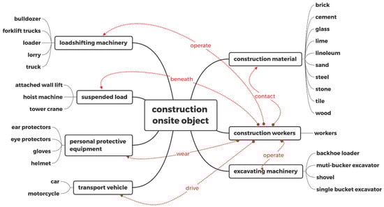 Currently, some visual relationship detection methods based on deep learning have been developed in order to detect the relationships of objects. The method is much more consistent with the practice of safety management. However, there is a shortage of combinations of computer vision and ontology methods to address the semantic gap []. Ontology is the formal representation of specific domain knowledge that explicitly defines classes, relationships, functions, axioms, and instances []. It expresses knowledge with clear and abundant semantics and prepares for knowledge query and reasoning []. Hence, the establishment of ontology is a significant problem.