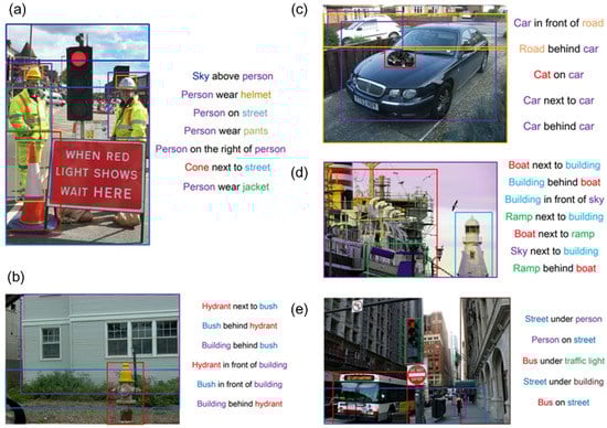 As shown in Figure 3a, seven visual relationships are detected, such as “sky above person”, “person wear helmet”, “person on street”, “person on the right of person”, “cone next to street”. The relationships present the major relationships between the objects onsite, such as actions (e.g., hold, wear, carry), geometry (e.g., beneath, in front of, on, in). The detected objects are mainly person, street, cone, helmet, jacket, and pants. In Figure 3a,e, all the objects, predicates and relationships are detected and predicted precisely, which suggests the feasibility of the method. In Figure 3b, there are three detected objects: hydrant, building, and bush. The interactions between the three objects in the image are predicted accurately such as “bush behind hydrant”, “building behind bush”. Despite the success of the detection and prediction results, the predicted relationships between the same two objects are multiple because the relationships are interactional. “Building behind bush” and “bush in front of building” are both right. Nevertheless, the interaction and relationship between such objects in safety rules are explicitly stipulated in advance. Hence, although the detection results are correct, the difference in triplet expression can cause problems in the comparison between visual information extracted from the images and the textual information in safety rules. In Figure 3c, the relationships between the detected objects cat, car, and road are predicted precisely. However, the predicates between the cars are “next to” and “behind”. The two interactions can both describe the relationships between the two cars but can also be problematic in our framework. Similar to the problem in Figure 3c, the relationships between the objects boat and building in Figure 3d are different but will not influence the understanding of humans. However, it is perplexing for computer-understanding tasks.
