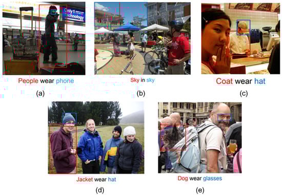 There also exist some errors in visual relationship detection. As shown in Figure 4, the detected triplets are “people wear phone” in (a), “sky in sky” in (b), “coat wear hat” in (c), “jacket wear hat” in (d) and “dog wear glasses” in (e). In the five examples, all the objects are detected correctly, but it went wrong in the relationship matching. The relationships are impossible in real life. The locations of the objects in the images are very close and it may cause false relationship detections. The below unlikely relations should be rejected through classeme features in relation detection module. It indicates that the knowledge transfer part needs to be improved.