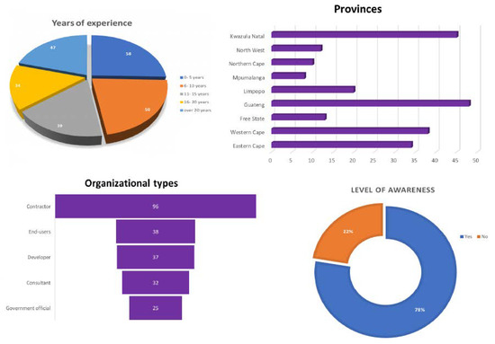 This section presents the background details of the 228 respondents who took part in this survey (see Figure 2). The responses came from South Africa’s nine provinces. Gauteng has the slight majority of respondents (48, 21.05 percent), followed by Kwazulu Natal (45, 19.74 percent), Western Cape (38, 16.67 percent), Eastern Cape (34, 14.91 percent), Limpopo (20, 8.77 percent), Free State (13, 5.70 percent) and North West (12, 5.26 percent), Northern Cape (10, 4.39 percent) and Mpumalanga has the fewest participants (8, 3.51 percent). The respondents worked in various organisations, with the majority of them being contractors (96, 42.11 percent), followed by client participants (38, 16.66 percent), developers (37, 16.23 percent), and consultants (32, 14.04 percent), with government officials having the fewest participants (25, 10.96 percent). Profession-wise, the finding revealed a slight majority as project and construction managers (47.96 percent), academia and others (38.46 percent), structural and civil engineers (11.76 percent), and architects (1.81 percent).