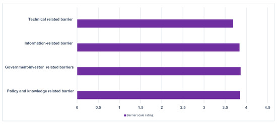 Each of the fourteen barriers is represented by one of the four underlying barrier groups (component)—policy and knowledge, government-investor, technical, and information-related barriers; the factor loading for each group is larger than 0.5, which demonstrates the consistency and reliability of the study’s findings and interpretation of the extracted individual component. Variables with factor loadings larger than or equal to 0.50, as indicated by Matsunaga [75] and Akintoye [76], will contribute considerably to the interpretation of the group factor.
