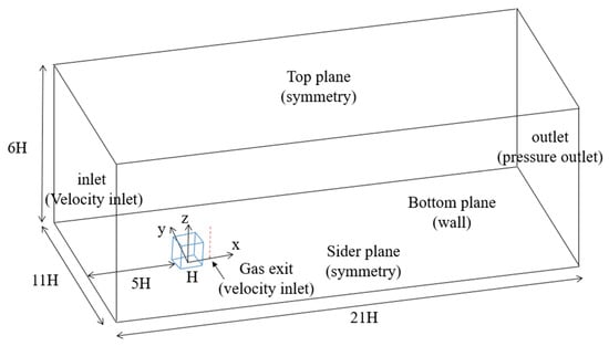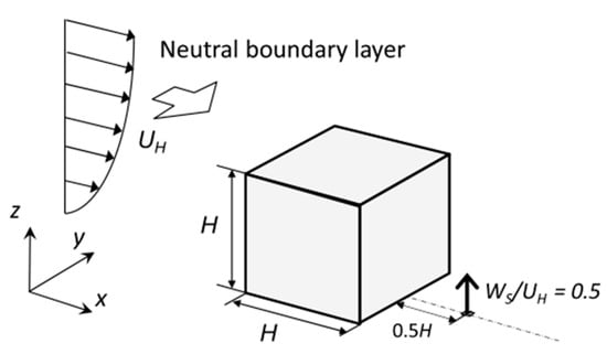 The details of the model of the experimental wind tunnel were as follows. First, a cubic model with a height of 0.2 m was set in the turbulent boundary layer, as shown in Figure 1. The external dimensions of the model building were 0.2 m (length) × 0.2 m (width) × 0.2 m (height) []. Second, the outlet for pollutants was a square, and the side length of the outlet was set as 0.005 m; it was located on the ground in the recirculation area behind the cube and 0.1 m away from the leeward wall of the building. The release velocity of the outlet gas was half of the inflow velocity on the inflow boundary.