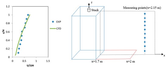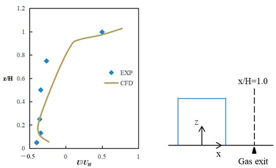 Figure 3 and Figure 4 show the comparison results of the CFD model of the single building. The two graphs compare the simulated and experimental data for normalized velocity and normalized pollutant concentration, respectively. H is the building height, is the reference wind velocity, x and z are the horizontal and vertical coordinates, and is the reference concentration: