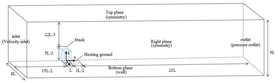 The wind tunnel experiment of Huang et al. [] was selected. In their study, the wind tunnel model was composed of a cuboid building of L (length) × L (width) × 3L/2 (height), where L = 0.2 m. A cylindrical chimney with an internal diameter of 0.007 m and a height of L/6 was in the center of the building. The entrance velocity vector was perpendicular to the windward side of the building. The leeward side and adjacent ground were heated to simulate solar radiation.