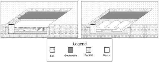 RCs are part of the market segment known as modular tank systems, which represent a 59% share of the USD 516.1 million worldwide stormwater detention system market as of 2021 []. RCs allow for decentralized infiltration, with installations placed nearby each area of impervious surface area. They are popular in urban streetscapes and often placed under parks and recreation areas to achieve green space requirements in suburban developments []. Moreover, approaches that limit stormwater runoff from the urban built environment align with green building rating systems and guidelines such as LEED, which place an emphasis on best management practices for stormwater management. The RC SCM features an underground structure that collects water during storm events, allowing the collected storm water to slowly infiltrate into the underlying soil over 24 or 48 h following the rain event. Infiltration capability of the underlying soil is a key consideration for RC design. The underground structures are assembled as building blocks or positioned as individual units to accommodate the geometry of the site. The individual building block structures take the form of a box or an arch with significant void space for water storage. Materials used for these structures include concrete or plastic, among which polypropylene (PP) and polyvinyl chloride (PVC) may be used. Some solutions can be stacked as layers deeper into the ground to reduce the surface area footprint. Examples of single-layer plastic box and arch structures are illustrated in Figure 1.