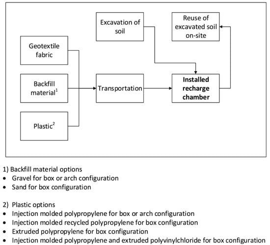 System diagram for cradle-to-gate LCA of box and arch recharge chambers showing options for plastic and backfill. Boxes represent cradle-to-gate processes and arrows represent material flows.