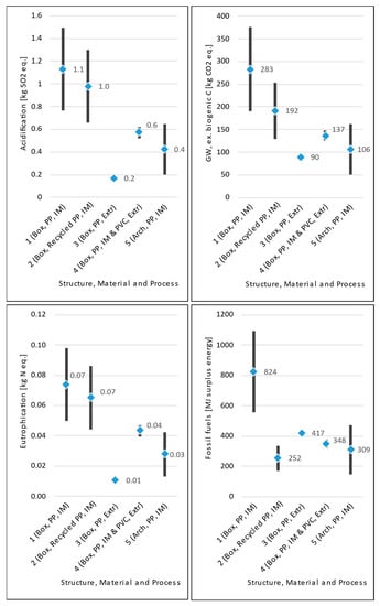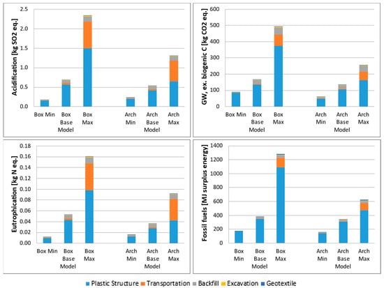 Cradle-to-gate LCIA of various plastic RCs inform practitioners of the range of potential midpoint impact this SCM imparts through the installation phase. The LCA software package, GaBi ts version 8.7, Leinfelden-Echterdingen, Germany [], whose earlier version is described in [], is used for the modeling of the box and arch inventories as documented in Table 1. The midpoint impact categories of acidification, eutrophication, global warming, and fossil fuel resources are assessed via TRACI 2.1 [,,,].
