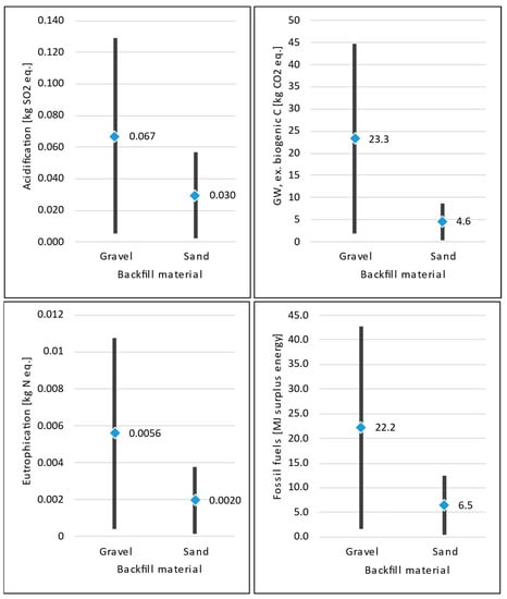 Traci 2.1 midpoint impact of backfill material choice showing gravel with higher impact than sand by more than 2:1. Diamonds represent the midpoint, and the black bars represent the range.