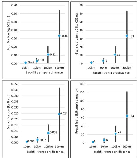 Distance for transportation of the gravel or sand backfill material, which is the inventory item with the largest mass, raises the life cycle impact. The impact could be more than that of the plastic material should gravel or sand need to be transported as far as 300 km from the quarry (gravel) or from the coast (sand) to the stormwater management installation site (Figure 6).