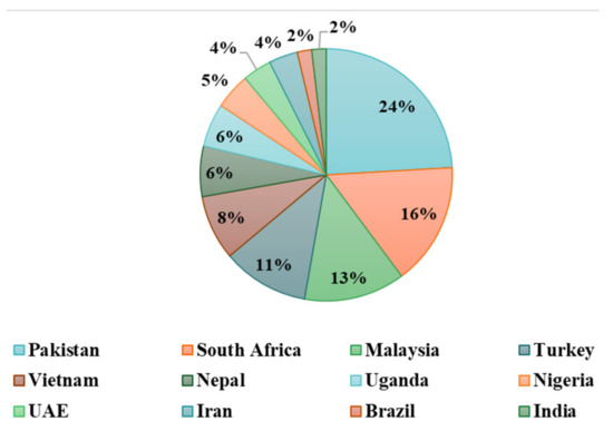Due to the lack of research on the developing economies, these countries were identified following [82,111]. The geographical distribution of the respondents is shown in Figure 2. Major respondents were from Pakistan, South Africa, Malaysia, Turkey, Vietnam, Nepal, Uganda, Nigeria, UAE, Brazil, and India.