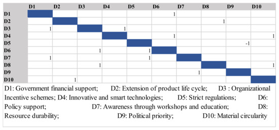 Figure 3 represents the influence matrix, which shows the influence and polarities among the impacting and impacted enablers. The x-axis shows the impacted variable, whereas the y-axis represents the impacting variable. The value of +1 in the matrix shows a positive (direct) relationship, and the value of −1 indicates a negative (indirect) relationship between the enablers following [68,84]. A total of 10 enablers with 14 relationships helped to develop the CLD.