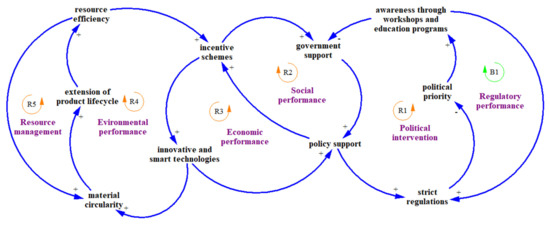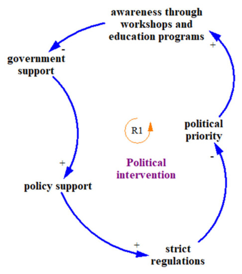 The reinforcing loop (R1) shows that an increase in policy support increases the implementation of strict regulations, leading to a decrease in political priority. Due to this, there is a decrease in awareness through workshops and education programs which leads to the need for increased government financial support, as shown in Figure 6. Hence, this loop shows that if strict regulations are implemented, some political parties will not take an interest in their enforcement, due to which awareness would also be decreased. Strict rules are critical in the implementation and enforcement of policies. A strict regulatory framework can help direct sustainable development to the appropriate level. Due to this decrease in awareness, an increase in government financial support would be required, further leading to an increase in policy support that enhances the interest in the CE paradigm [112,113]. R1 presents how CE implementation can foster CI in developing countries due to the support from the government (financial) and political parties through policies, strict regulations, and awareness programs.
