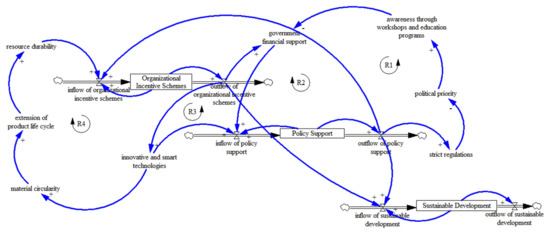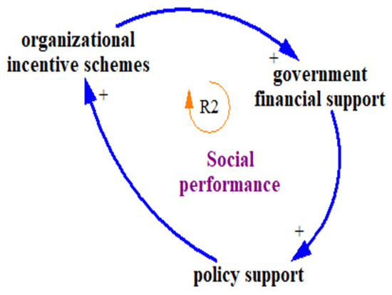 The reinforcing loop (R2) shows that an increase in government financial support can lead to an increase in policy support, which helps to achieve organizational incentive schemes, as shown in Figure 7. The adoption of sustainable practices is sometimes accomplished by rewarding incentive schemes. Hence, this loop shows that strong financial support can lead to policymaking along with many of the organizational incentive schemes, which will ultimately help enforce the CE policies at the best level [114]. This leads to an increase in social performance, leading to sustainable development in the CI of developing countries via the inclusion of organizational incentive schemes and support via government and policies.