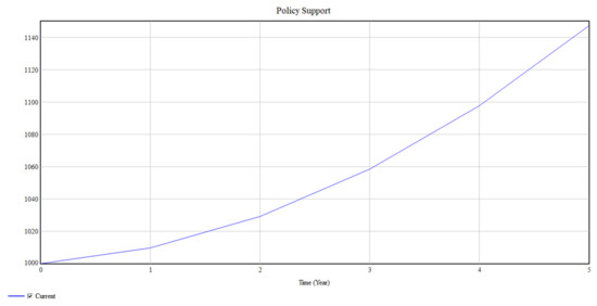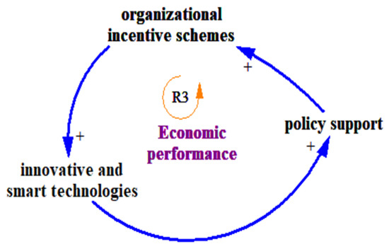 The reinforcing loop (R3) shows that an increase in policy support can increase organizational incentive schemes, leading to an increase in innovative and smart technology adoption. Such adoption will ultimately reinforce the policy support, as illustrated in Figure 8. Hence, this loop predicts that if policy support is offered, it can lead to the availability of organizational incentive schemes for the CE’s successful implementation. Due to the availability of such incentive schemes, the adoption of innovative and smart technologies would be enabled, resulting in stronger policy support [113,115]. R3 shows an increase in the economic performance of CI in developing countries due to the use of smart technologies, organizational incentive schemes, and policy support.