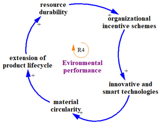 The reinforcing loop (R4) shows that an increase in the adoption of innovative and smart technologies can lead to material circularity, due to which there will be an increase in the product life cycle. This increase will lead to an increase in resource durability, leading to a further increase in organizational incentive schemes, as presented in Figure 9. Hence, this loop shows that due to the use of innovative and smart technologies, there would be an increase in material circularity, leading to an increase in the product life cycle. The increase in the product’s life cycle shows that the resource durability will increase; in return, more organizational incentive schemes will be provided for the successful implementation of the CE. Product life cycle extension aims to depart from create–use–dispose toward create–use–reuse. This persistent cycle immediately impacts society, ecology, economics, and the environment [116]. R4 presents how the environmental performance is enhanced due to the product lifecycle extension, resource durability, and material circularity, leading to sustainable development in developing countries.