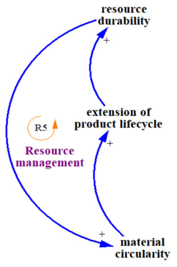 The reinforcing loop (R5) shows that an increase in the material circularity will lead to an increase in the product life cycle’s extension, leading to increased resource durability. Such increased durability will further lead to an increase in material circularity, illustrated in Figure 10. Hence, this loop predicts that if the materials remained in the loop (or more circulated and reused), an increase in the product’s life cycle would be observed, leading to the efficient utilization and durability of the resources [117]. R5 depicts that resource durability, product lifecycle extension, and material circularity lead toward sustainable development of the CI in developing countries.