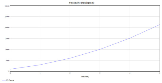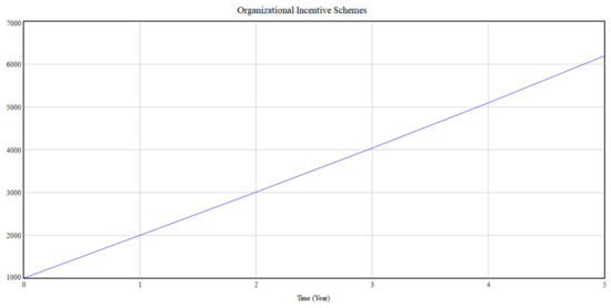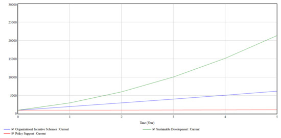Vensim® was used to create the SD model from CLD, as illustrated in Figure 11. The model is made up of three stocks: “Organizational Incentive Schemes,” “Policy Support,” and “Sustainable Development,” all of which were influenced by inflows and outflows. The organizational incentive schemes and policy support were chosen as stocks because they showed accumulation and were the two enablers with the highest interrelationships with the other enablers. As a result, they are displaying the cumulative effect of variables in relation to them, affecting sustainable development, which is a new stock established to reflect the holistic influence of the system. The information gathered in the final survey also aided in formulating the model’s equations as given in equations 3 to 5: