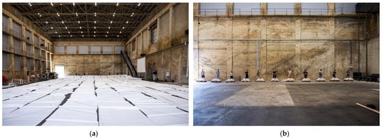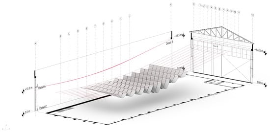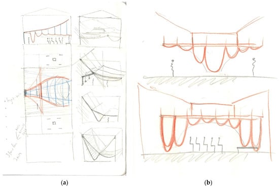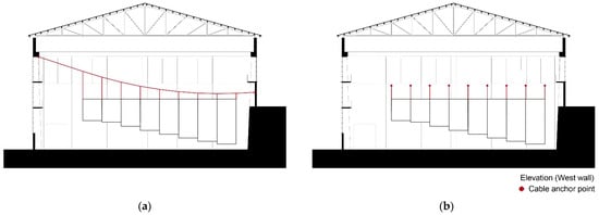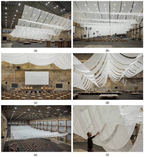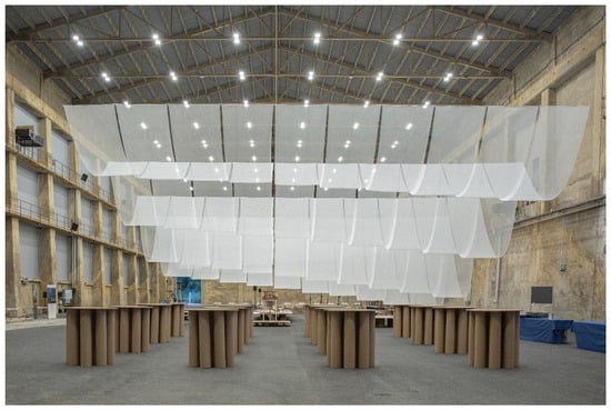 Figure 8a). However, the presence of windows heavily limited the freedom in choosing locations for the hanging structure’s anchor points. Moreover, because of the inevitable sagging of the cable when spanning, it was difficult to maintain the same height for fabric strips that belong to the same row. This would have called for the need to add a second array of cables in addition to the main one, which would have significantly affected the simplicity and abstraction of the overall form. Therefore, we ultimately decided to suspend the fabrics along the building’s longitudinal axis (