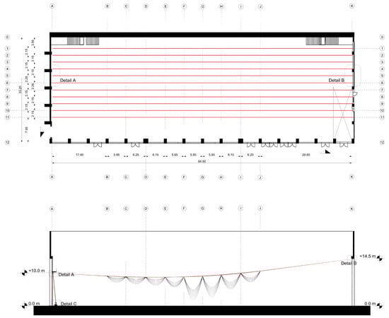 Kiesofenhalle. Even though the building footprint is symmetrical in its short section, the north side of the façade is almost entirely closed with a solid retaining wall, whereas the south side of the building has stunning continuous windows that give the building a sense of breathing. Due to the shorter transversal distance, the first test comprised an array of parallel cables along this direction (