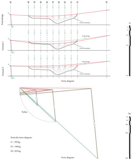 Figure 11 shows the final geometry, as well as two variants with a slightly lower (Variante 1) and higher (Variante 2) cable. The corresponding force diagrams show the change of the force F in the cable connected to the counterweight according to the three different geometries. It is worth mentioning how the force in the cable is extremely sensitive to changes in cable height and vice-versa. Thanks to the use of graphic statics, this dependency between design parameters (i.e., depth of the cable sag, force in the cable, and reaction forces) is represented in an explicit manner. The manipulation of form and force diagrams represented an extremely important design tool that allowed controlling the form of the cable and the resulting forces in the walls jointly. The geometric lower boundary of the installation is determined by the separation function that the fabric needs to provide. The final design is, therefore, a tradeoff that enhances the expressiveness of the canopy and its functional aspects, while keeping the forces under control.