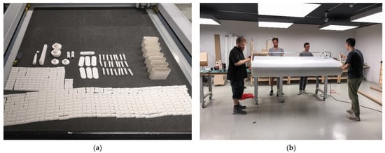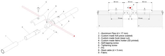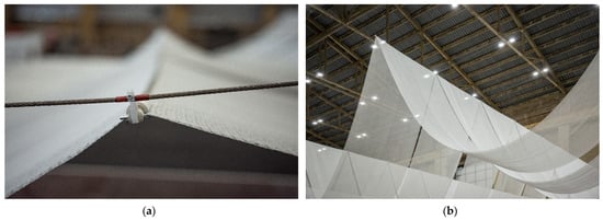Figure 14a). This made it possible to quickly hang and adjust them on-site during construction. To ensure that the fabric folding position could be precisely measured and that the aluminum pipes could be fastened without creating creases or discoloration of the fabric from repeated fabrication processes, a customized rolling machine was developed at the Raplab at ETH (